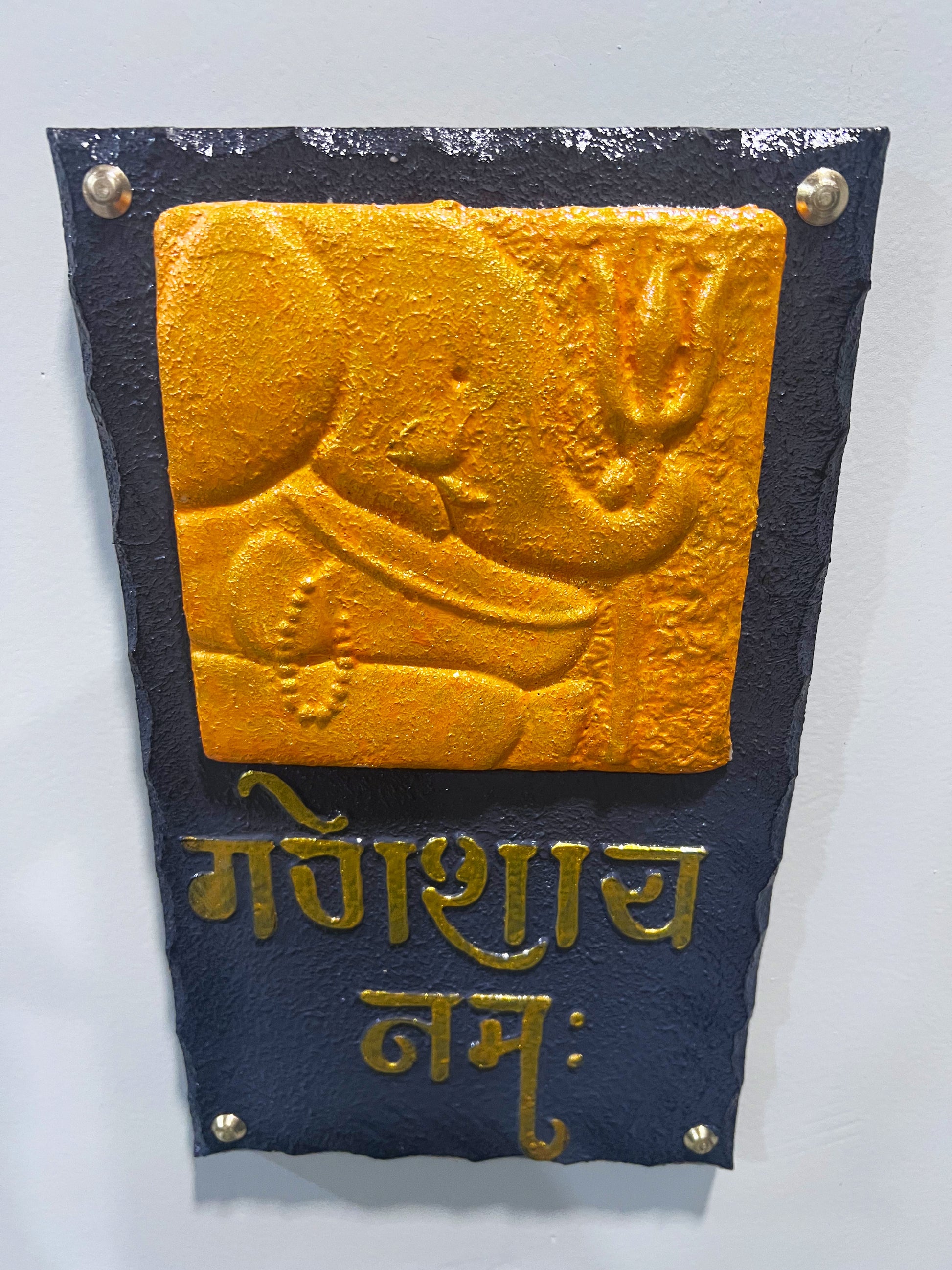 This exquisite handmade 3D mural features Lord Ganesha symbolise GOOD LUCK, enhanced with textured mantras for added spiritual depth.