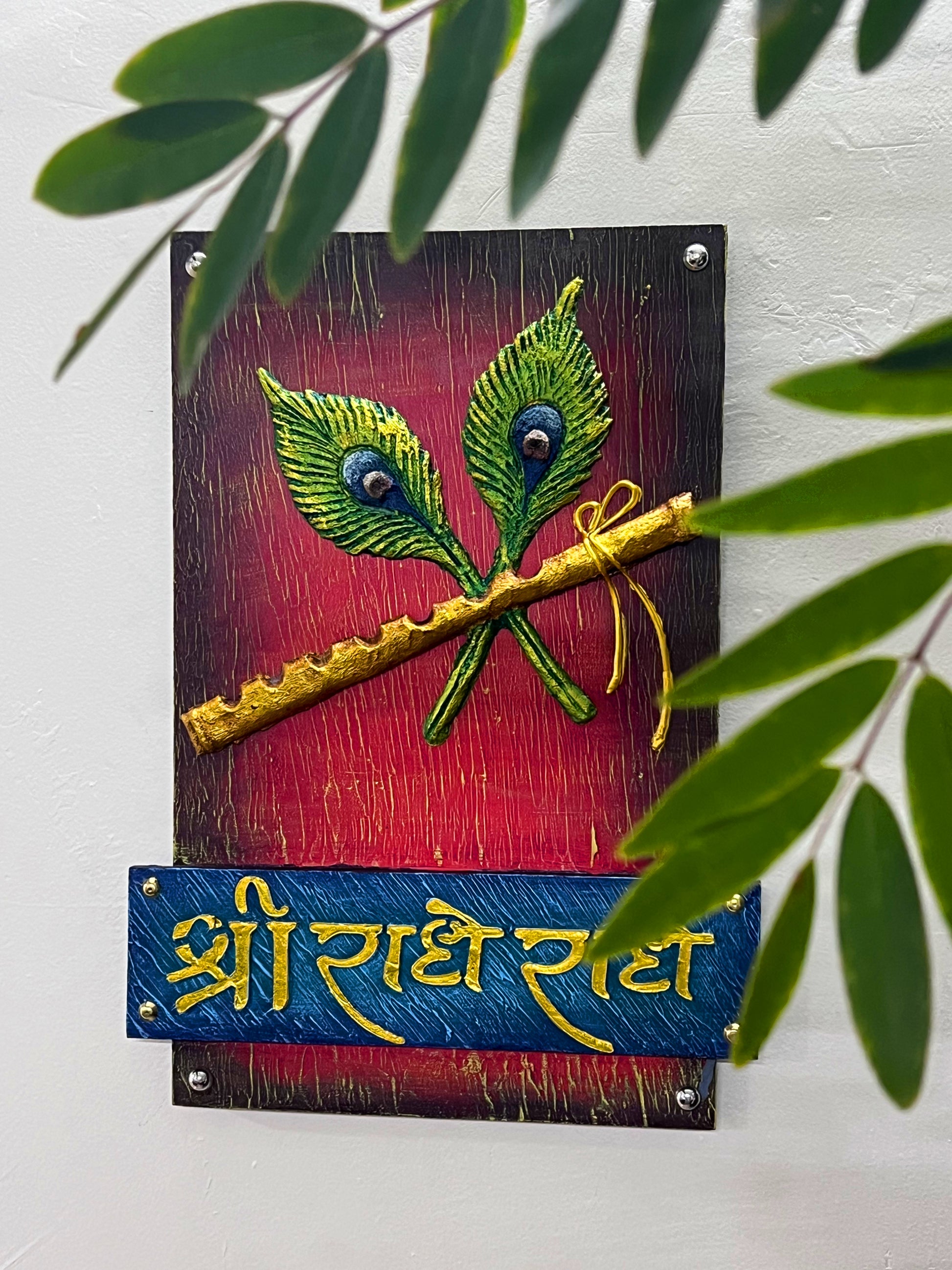 The Bombay Craft House™ Lord Krishna Bansuri 3D Mural Wall-Art with Texture Radhe Radhe Mantra For Home Decor.